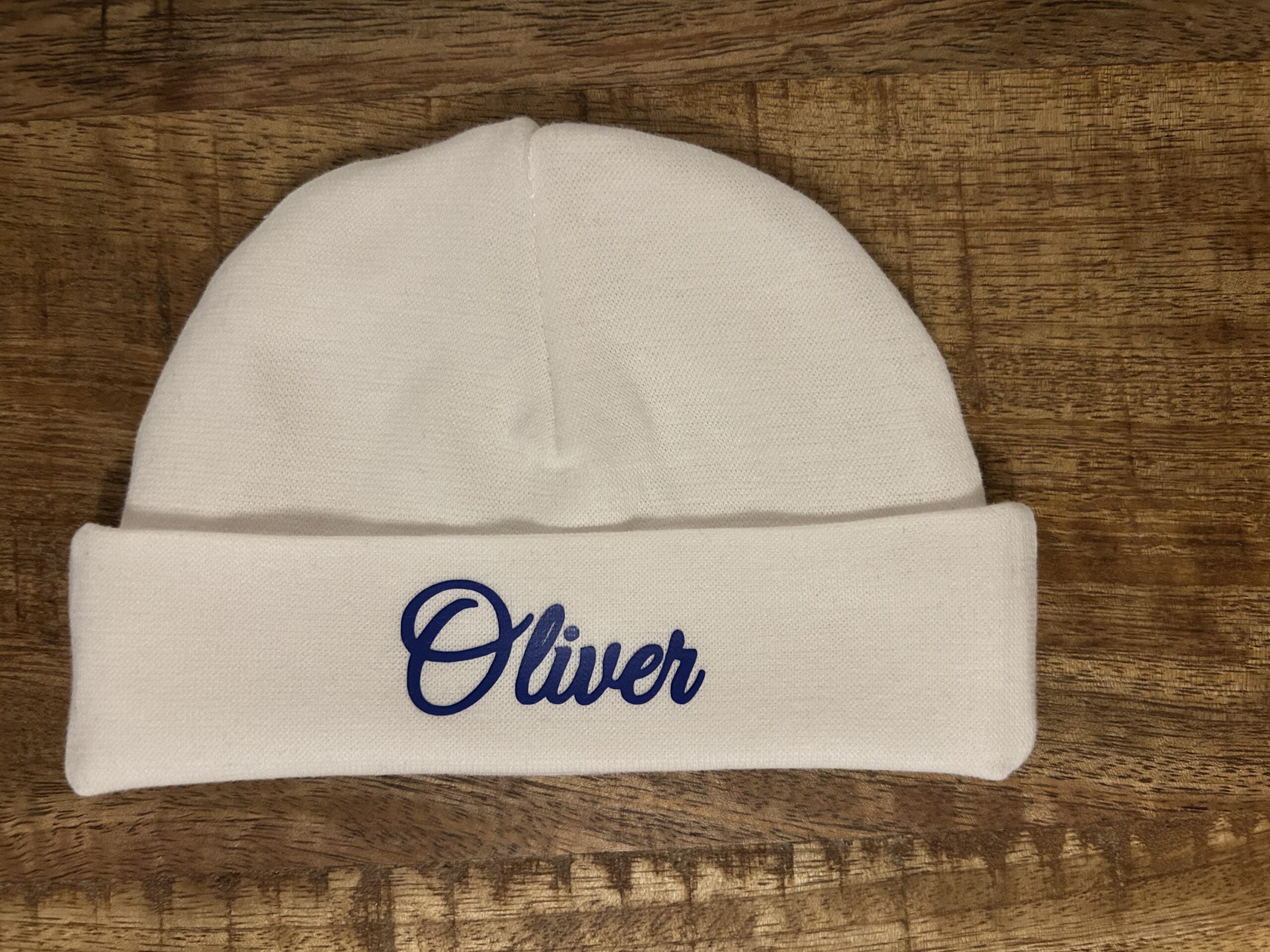 Het mutsje is wit en de kleur van de tekst kan gekozen worden.